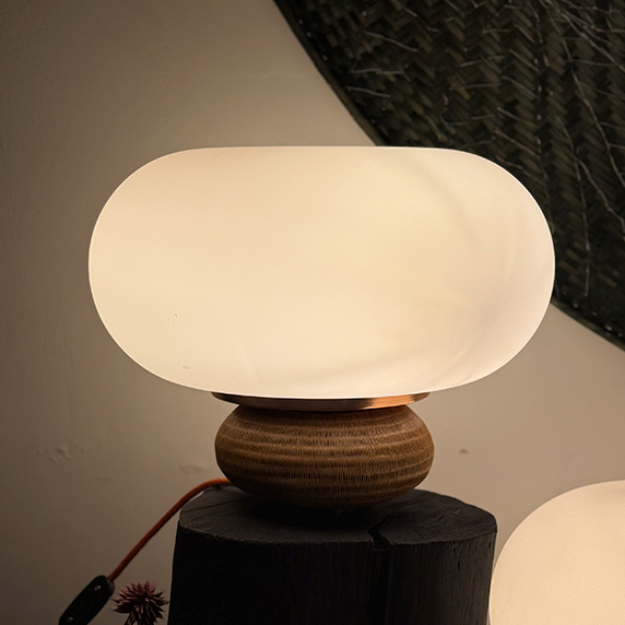 Esta lámpara mezcla y destaca la maestría artesanal de la cestería en Werregue, única en el mundo, con el vidrio soplado, oficio artesanal realizado en pequeños talleres en Bogotá.