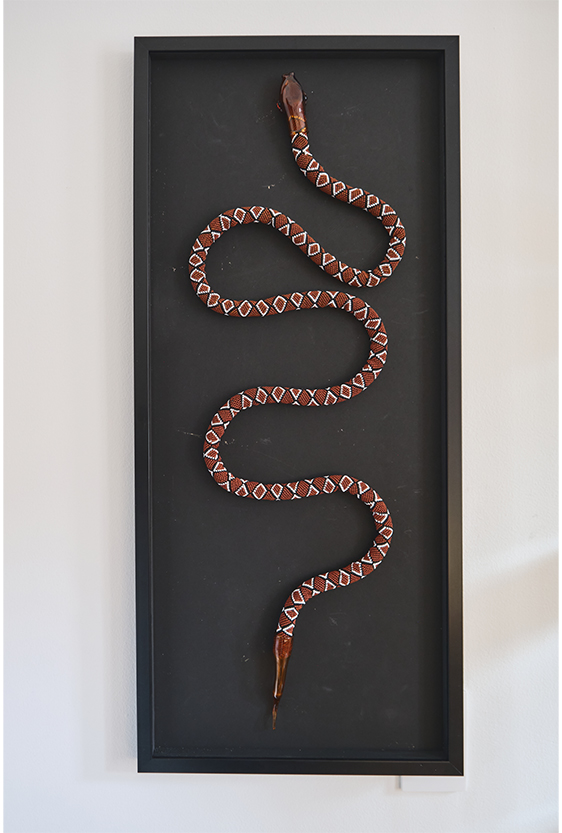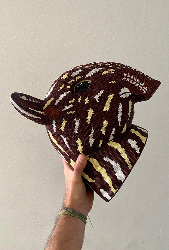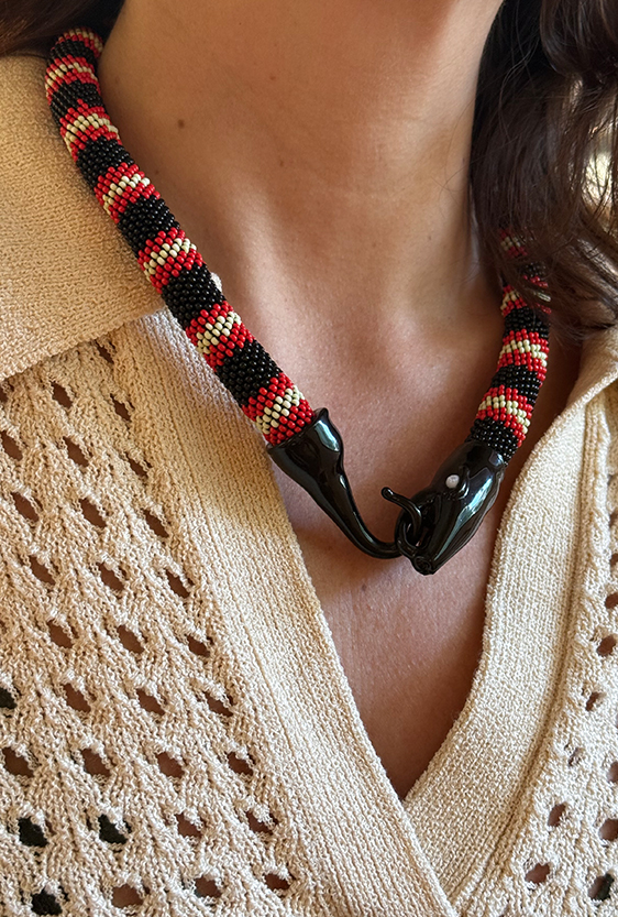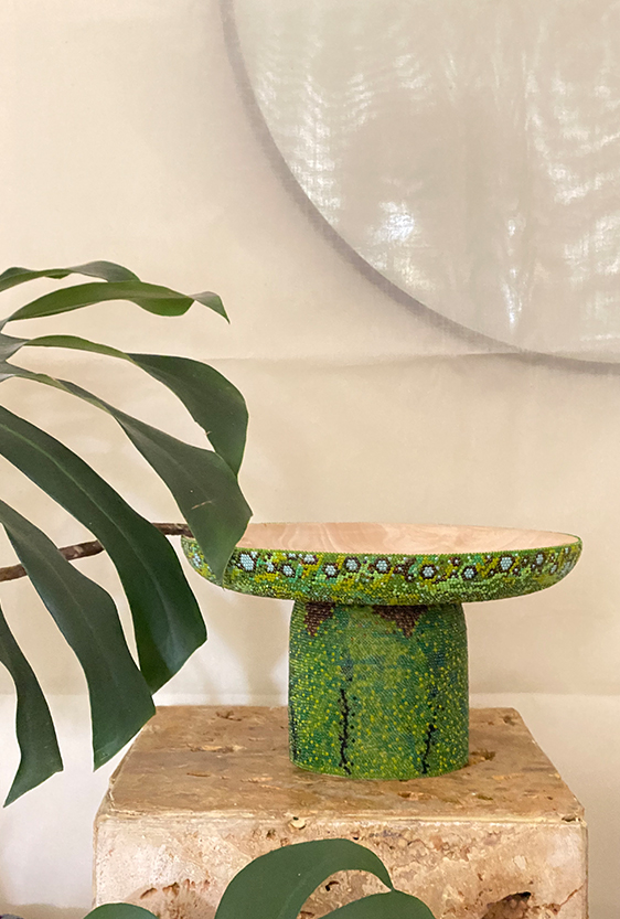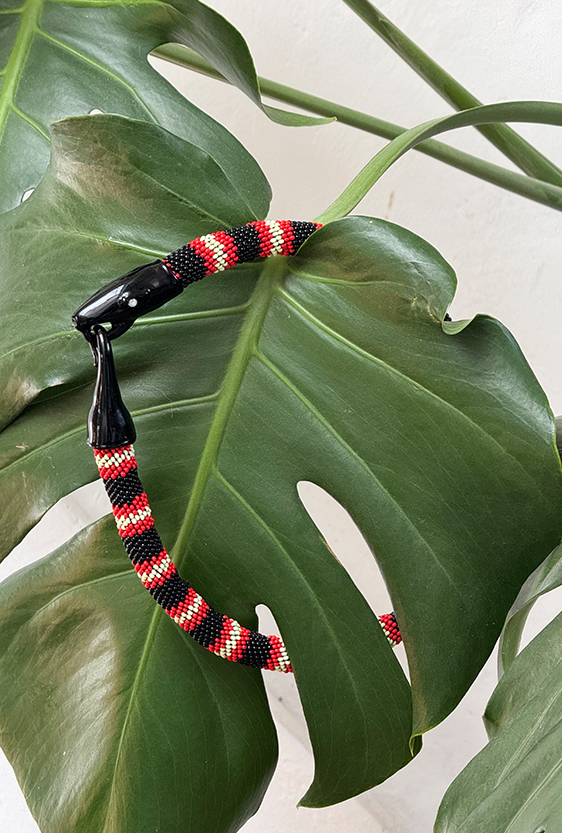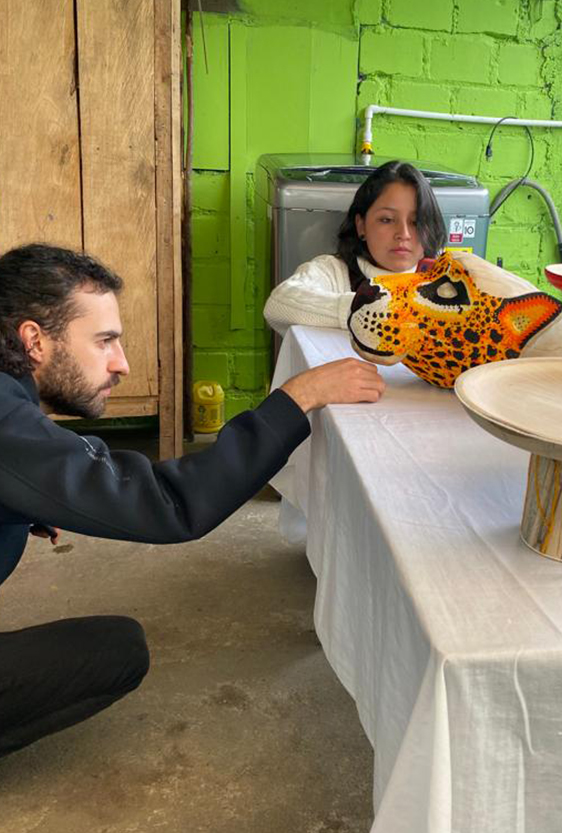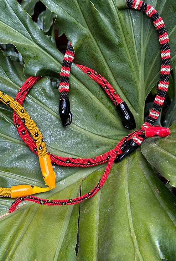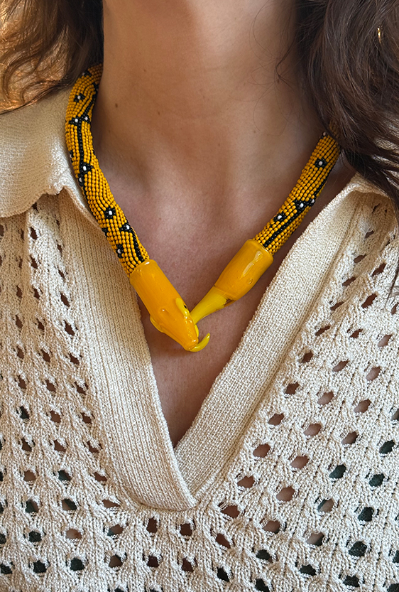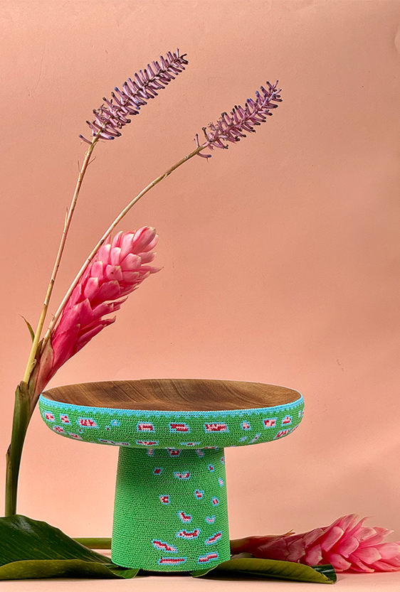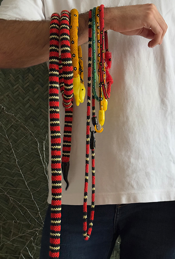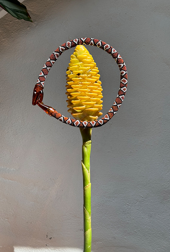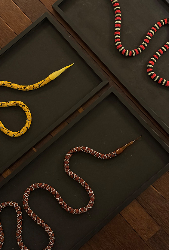 Each piece is unique, as are the animals that inspired them. The pieces are hand-carved from local woods harvested in the Meta department by Sikuani artisans; in Nariño by artisans skilled in the mopa mopa technique; and in Sibundoy, Putumayo, where Kamentza artisans decorate each piece with around 45,000 to 100,000 Czech beads. There are also snakes woven by Embera Chami women and furniture carved from blown glass in Bogotá.